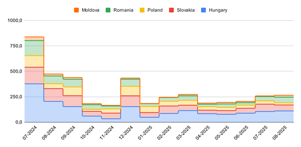 Структура експорту та імпорту в розрізі країн-партнерів залишилась майже незмінною порівняно з липнем. Однак експорт до Угорщини та Словаччини зріс, тоді як експорт до Молдови зменшився. І традиційно більшість імпорту надходила з Угорщини, а більшість експорту прямувала до Угорщини.