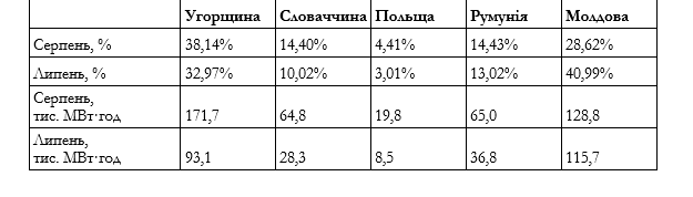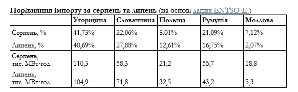 Порівняння експорту за серпень та липень (на основі даних ENTSO-E )