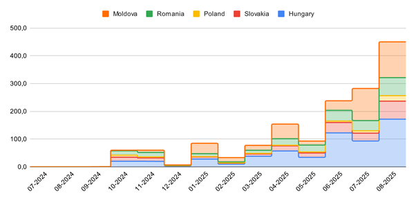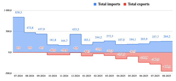 У серпні Україна експортувала 450,1 тис. МВт·год, що на 60 % більше, ніж у липні. Цей обсяг експорту є рекордним з моменту інтеграції української енергосистеми до європейської у 2022 році. Водночас імпорт збільшився лише на 2,5 відсотка порівняно з липнем (264,2 тис. МВт·год). Про це свідчать дані платформи прозорості ENTSO-E.