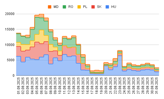 Добові обсяги імпорту електроенергії за країнами походження у серпні, МВт·год