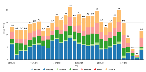 Зменшилися поставки в усіх напрямках, крім Польщі. З Польщі у вересні було поставлено 86,1 тис. МВт∙год, що на 78% більше, ніж у серпні. Найбільшим постачальником залишається Угорщина (35%), за нею йде Словаччина (24,5%). 16,5 тис. МВт∙год було імпортовано з Молдови, частина цих обсягів була реімпортована з Румунії.