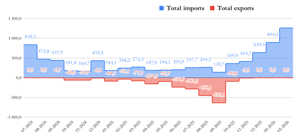 У лютому Україна імпортувала 1 262,8 тис. МВт·год електроенергії, встановивши новий рекорд. Нагадаємо, що в січні імпорт електроенергії також побив рекорди – 894,5 МВт·год. Експорт електроенергії не здійснювався через дефіцит потужностей в енергосистемі. Експорт було припинено 11 листопада 2025 року.