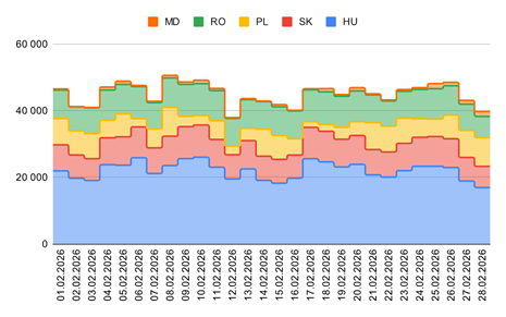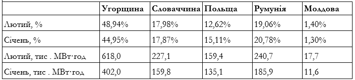 У лютому чистий імпорт газу в Україну (з урахуванням реекспорту та транзитного short-haul 3–6 млн м³ на добу) складав 17–26 млн м³ на добу з Угорщини, Польщі, Словаччини та невеликі обсяги з боку Молдови/Румунії.
