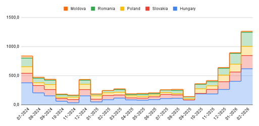 Найбільший обсяг потужностей було законтрактовано на угорському напрямку – 351 МВт. Додатково 109 МВт було придбано на словацькому та румунському маршрутах. Тим часом попит на доступ до перетинів значно перевищив наявні обсяги. Зокрема, попит на угорському маршруті становив 2775 МВт, що майже у вісім разів перевищує наявну потужність. На словацькому маршруті попит досяг 1238 МВт, а на румунському – 1019 МВт.
