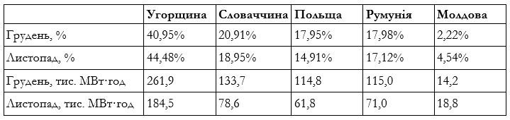 Традиційно, найбільша частка імпорту припадала на Угорщину. Загалом, структура імпорту електроенергії залишилася майже такою ж, як і в листопаді.