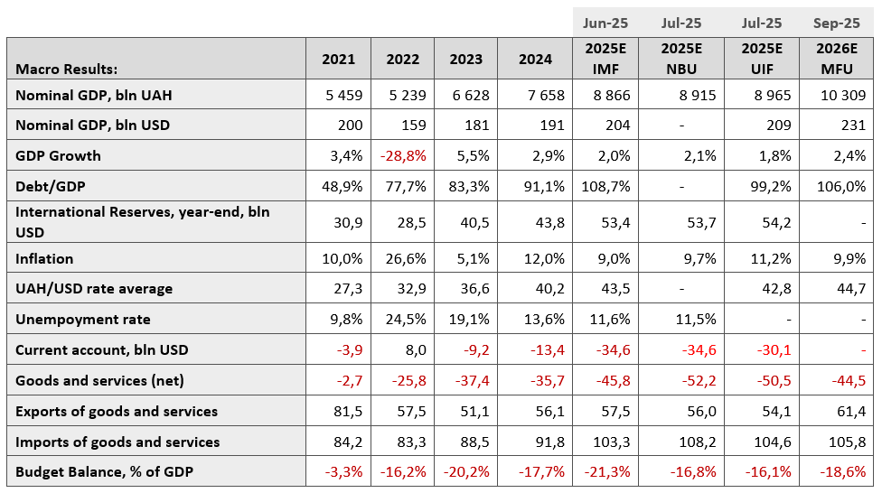 Державний борг на 1 вересня 2025 досягнув 192 млрд доларів. Прогноз Мінфіну — 240 млрд доларів державного боргу на кінець 2026 року. Міжнародні резерви у вересні 2025 року збільшилися з 46.0 до 46,5 млрд доларів.