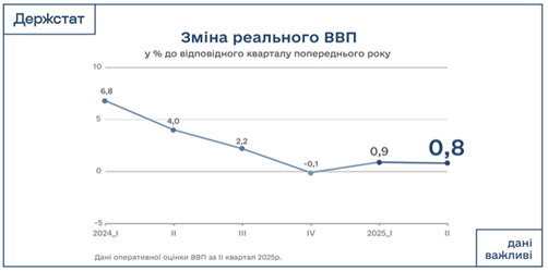 Укрстат оприлюднив оцінку зростання ВВП України у другому кварталі 2025 року. Зростання ВВП — 0.8%. Вже третій квартал поспіль українська економіка показує результат зростання нижчий ніж 1%.