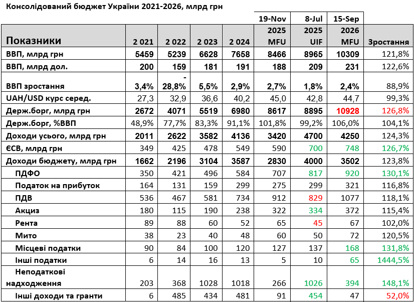 Консолідований бюджет 2021–2026. Джерело: Міністерство фінансів, Розрахунки UIF.