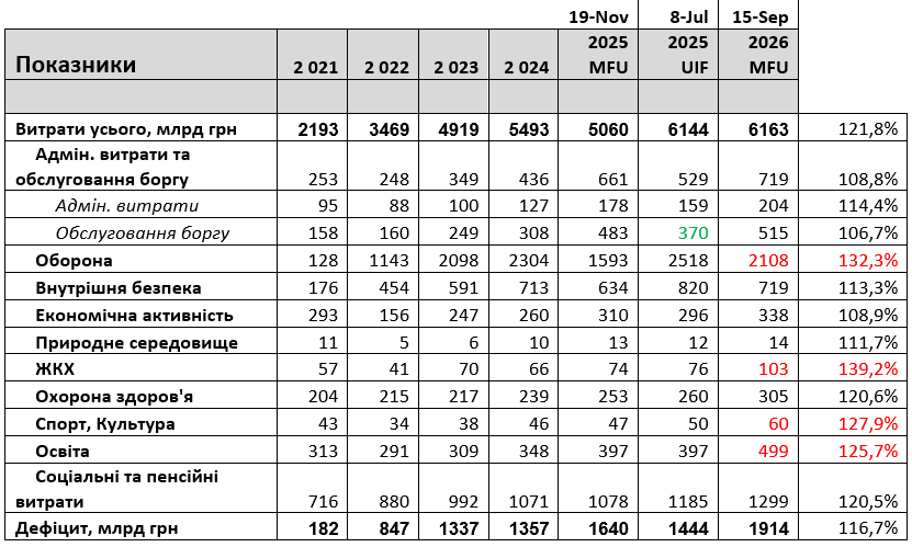 1. Пріоритет оборони зберігається. Власні витрати на безпеку (оборона + внутрішня безпека) збільшено на 600 млрд грн. Важливо відзначити, що вищі витрати на оборону в прогнозі UIF на 2025 рік пояснюються включенням додаткових 700 млрд грн військової продукції, переданих до бюджету, які відсутні в проєкті бюджету 2026 року від Мінфіну.