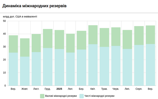 Міжнародні резерви у вересні 2025 року збільшилися з 46.0 до 46,5 млрд доларів.