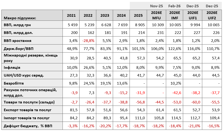 МВФ бачить зростання української економіки у 2026 році на рівні 1,8–2,5% (за розрахунками 1,8%). Інфляцію у 2026 році — на рівні 7,5%. Курс гривні щодо долара МВФ традиційно не вказує, але за розрахунками середній курс — близько 45,0 гривень за долар.