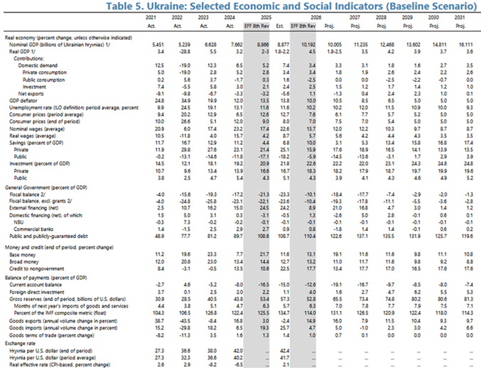 МВФ у своєму звіті за новою програмою МВФ традиційно не вказує курс розрахунку показників. Але за нашими розрахунками, МВФ бачить ВВП України у 2026 році на рівні 223 млрд доларів при номінальних цифрах у гривні — 10005 млрд гривень. Це середній курс біля 45 гривень за долар.