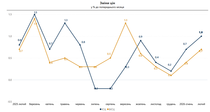 Інфляція на споживчому ринку в лютому 2026 року порівняно із січнем становила 1,0%, із лютим 2025 року — 7,6%. Це зміна тренду. Річна інфляція знову пішла вгору.
