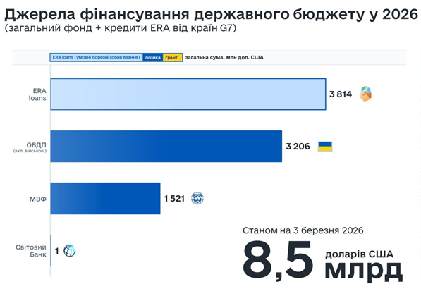 За розрахунками МВФ Україна повинна у 2026 році отримати 51,4 млрд зовнішнього фінансування. 3,8 млрд від МВФ, 26,8 млрд доларів від ЕС в рамках 90 млрд євро програми, 10,6 млрд за рахунок ERA. Це переважно гроші від США та Японії, а також 9,8 млрд від інших кредиторів.