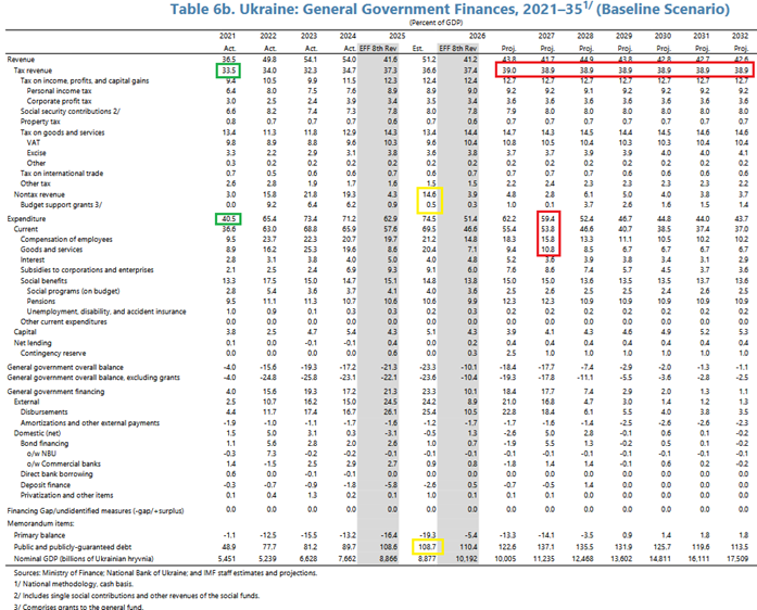 Ми повинні тут відзначити дуже великий дефіцит бюджету у 2027 році (17,7% ВВП), Це свідчить про те, що у першому мирному році (за припущенням МВФ) Уряд України не планує скорочувати витрати і фінансуватиме дефіцит борговими запозиченнями, наростивши борг до 137% ВВП (розрахунки МВФ).