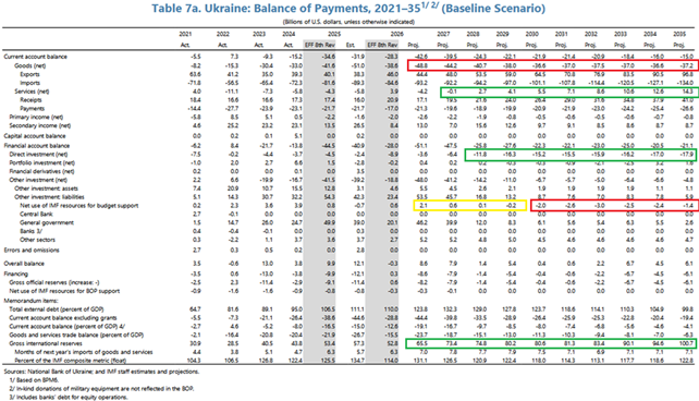 1. Теза МВФ щодо програми, яка повинна вирішити проблему платіжного балансу України, не витримує критики. За даними МВФ чисте фінансування України у 2026–2029 роках складе 2,6 млрд доларів за 4 роки (жовтий колір) та -14 млрд доларів у 2030–2035 роках. Крім того, за оцінками МВФ, міжнародні резерви протягом 4 років зростуть з 57,3 до 80,6 млрд доларів. Це формує думку, що ніякої проблеми платіжного балансу в Україні не існує.