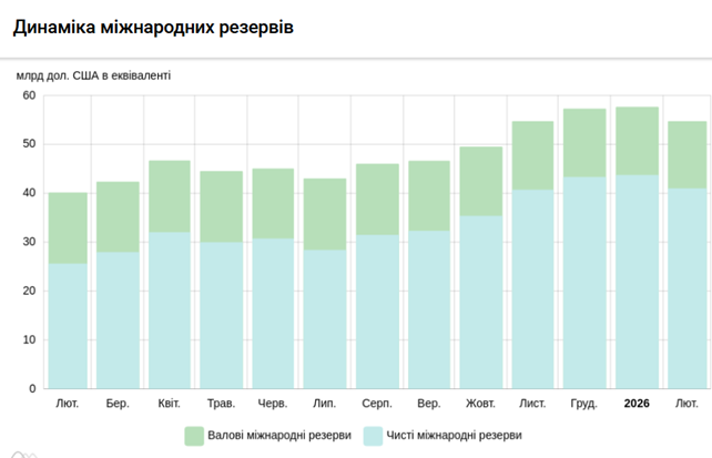 Міжнародні резерви за лютий 2026 року зменшилися з 57,7 до 54,8 млрд доларів.