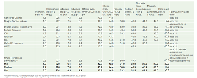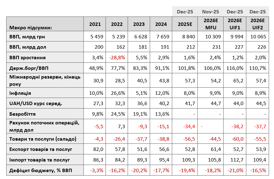 У більшості неурядових прогнозів закладене повільне зростання економіки у 2026 році, якщо війна продовжиться весь рік, та зниження інфляційних процесів до 6–8% у 2026 році. При цьому більшість бачать незначну девальвацію гривні у 2026 році, меншу потребу у зовнішньому фінансуванні та падіння міжнародних резервів. Наприклад, KSE вважає, що на кінець 2026 року міжнародні резерви впадуть з 55 до 31 млрд доларів при незначній девальвації гривні.
