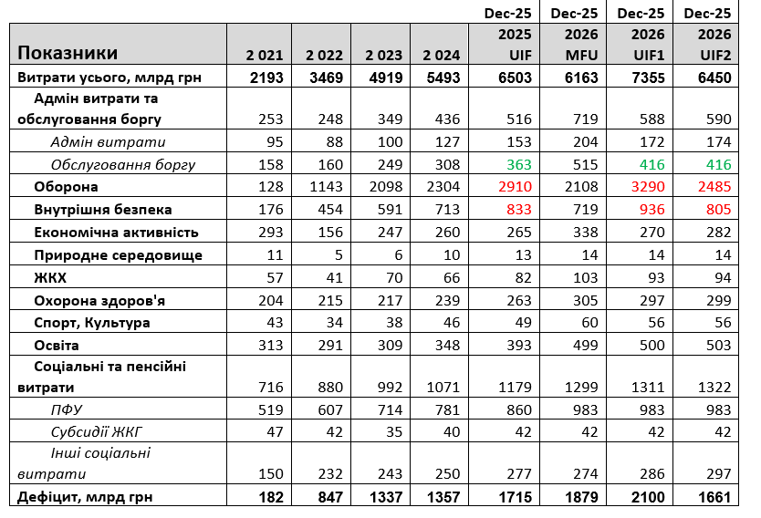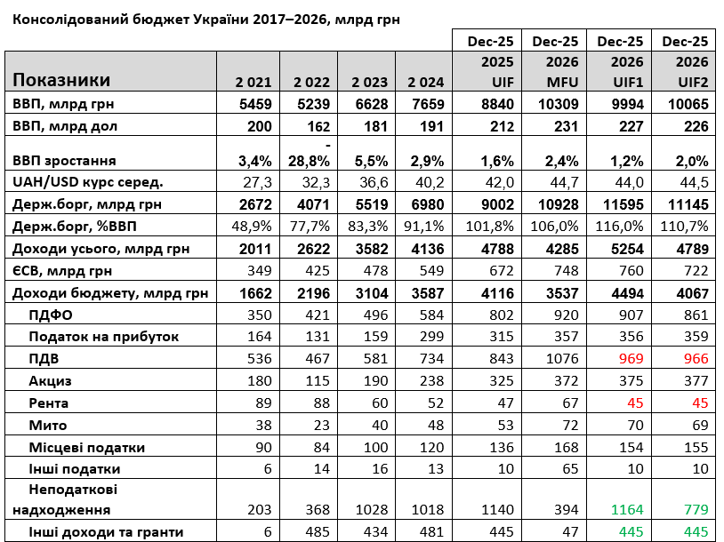Прогноз Українського інституту майбутнього на 2026 рік консолідованих фінансів було сформовано за двома сценаріями. Перший — війна весь 2026 рік, та другий — закінчення війни у 2026 році.