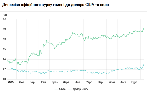 2025 рік було закінчено з курсом 42.35 гривня/долар. А середній курс гривні до долару у 2025 році склав 41.69. Це менше ніж на початку 2025 року (41.95 гривня/долар).
