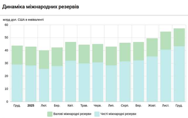Міжнародні резерви у грудні 2025 року збільшилися з 54,7 до 57,3 млрд доларів. Це новий історичний рекорд України.