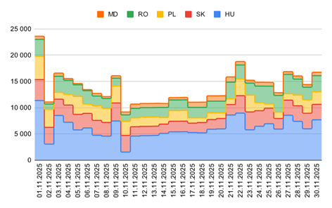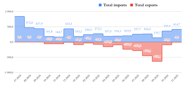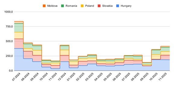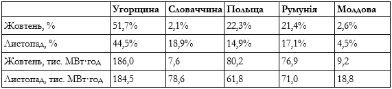 У листопаді Україна імпортувала 414,7 тис. МВт·год порівняно з 359,9 тис. у жовтні. Частки імпорту зі Словаччини зросли, тоді як частки Угорщини та Польщі знизилися, оскільки наприкінці жовтня після технічного обслуговування було введено в експлуатацію лінію електропередач до Словаччини.
