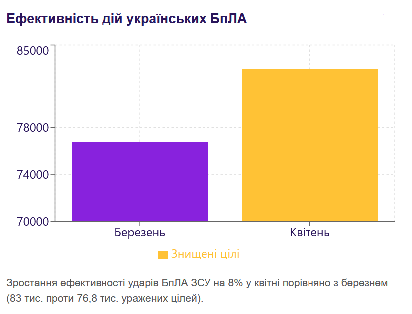 Зростання ефективності застосування БпЛА ЗСУ на 8% порівняно з березнем — понад 83 тис. уражених цілей за квітень. Розширення виробництва ОВТ — МОУ кодифікувало 120+ нових зразків ОВТ у квітні (85% вітчизняного виробництва), всього з початку року кодифіковано понад 400 новинок українського виробництва.