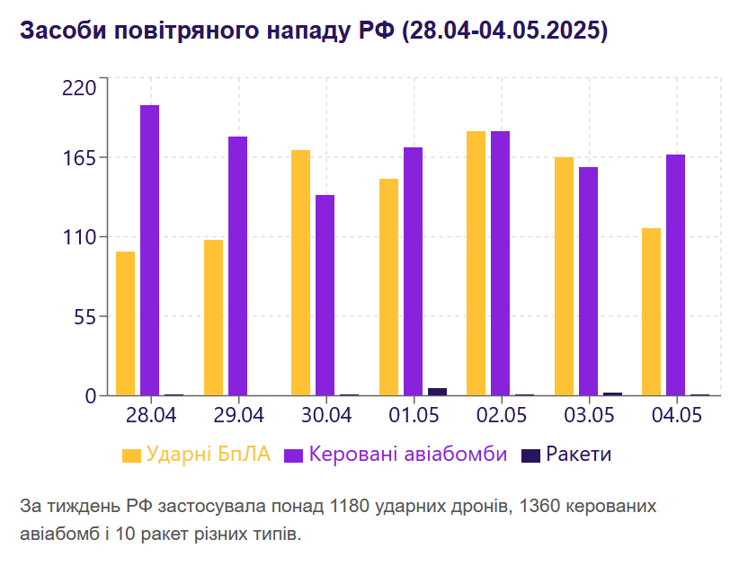 За тиждень РФ випустила понад 1180 ударних дронів, 1360 КАБ і 10 ракет, продовжуючи систематичні удари по цивільній і критичній інфраструктурі та військових об’єктах. Особливість тижня — продовження денних атак БпЛА. Вперше в історії СОУ знищено бойовий літак РФ ракетою з борту безекіпажного катера.