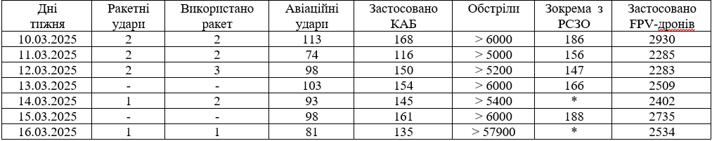 Огляд ситуації у воєнній сфері в період з 10 по 16 березня 2025 року