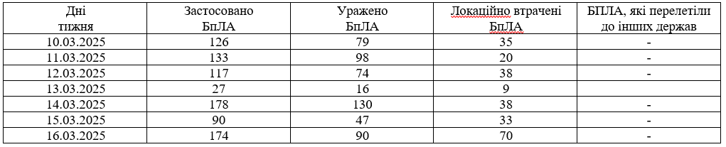 • протягом тижня (з 10.03.25 по 16.03.25) протиповітряною обороною збито 850 засобів повітряного нападу противника, зокрема 1 балістичну ракету «Іскандер-М»/KN-23, 515 ударних БпЛА типу «Shahed»; 170 розвідувальних БпЛА; 172 БпЛА інших типів;