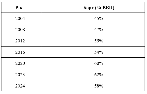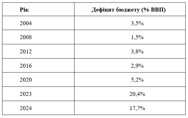 Відповідно до останніх даних (Табл. 2), у 2023–2024 роках дефіцит різко зріс через пандемію COVID-19, військові витрати та соціальні програми [19].
