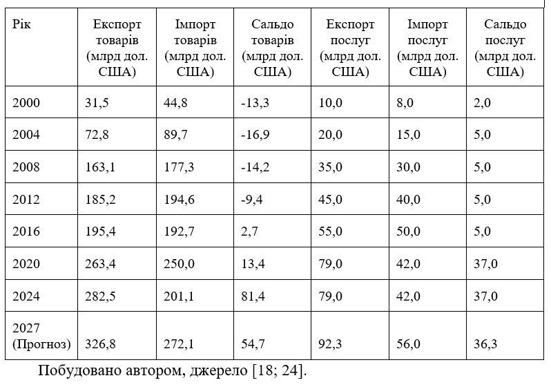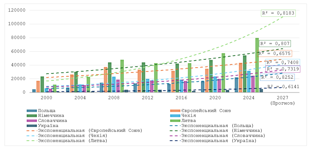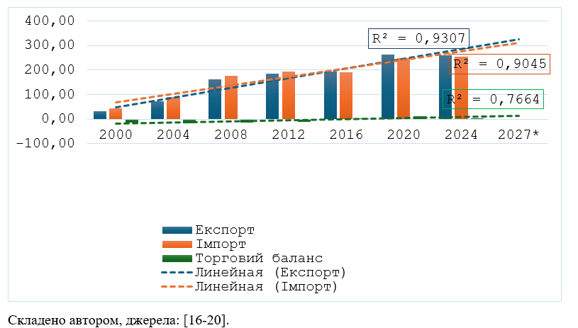 Лінійне прогнозування динаміки зовнішньої торгівлі Польщі з країнами Європейського Союзу на 2027 рік, здійснене на основі аналізу даних за 24-річний період, засвідчує збереження позитивних тенденцій за всіма ключовими показниками. Прогнозується подальше зростання обсягів експорту та імпорту, утримання позитивного зовнішньоторговельного балансу, а також збільшення сукупного обсягу торгівлі до понад 615 млрд дол. США. Прогнозні розрахунки на 2027 рік свідчать про подальше посилення позицій Польщі як експортера в межах ЄС, однак для підтримання стійкої позитивної динаміки необхідним є розширення ринків збуту та активізація інвестицій у високотехнологічні сектори економіки.