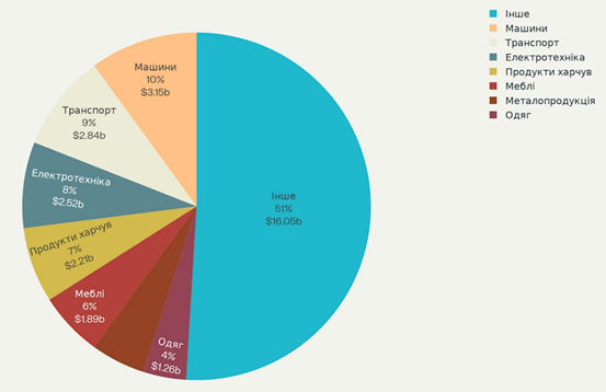 Як засвідчують дані рисунка 3, у 2000 році (до вступу Польщі в ЄС) загальний обсяг експорту товарів становив 31,5 млрд дол. США, при цьому понад половину структури експорту формувала різнорідна категорія «Інше», що вказує на фрагментованість та недостатню спеціалізацію товарної номенклатури постачань. Серед основних груп експортованих товарів переважали машини й обладнання (10%), транспортні засоби та комплектуючі (9%), а також електротехнічна продукція (8%). Значна частка продовольчих товарів і меблів відображала наявність конкурентних переваг у трудомістких та аграрних секторах, що було характерно для початкового етапу інтеграції Польщі до європейського економічного простору.
