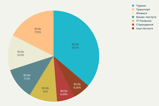 У 2000 році експорт послуг Польщі до країн Європейського Союзу (Рис. 5) становив 10 млрд дол. США. Основними статтями експорту виступали транспортні послуги (2,8 млрд дол. США або 28%) та туристичні послуги (2,5 млрд дол. США або 25%), які загалом формували понад половину його структури. Така ситуація свідчить про наявність у Польщі конкурентних переваг у сфері перевезень, що зумовлено вигідним географічним положенням та низькими логістичними витратами, а також про ефективне використання транзитного потенціалу. Інші напрямки експорту, зокрема бізнес-, будівельні, фінансові, ІТ- та телекомунікаційні послуги, залишалися порівняно малими, проте закладали підґрунтя для подальшої диверсифікації структури експорту та зростання частки послуг із вищою доданою вартістю.