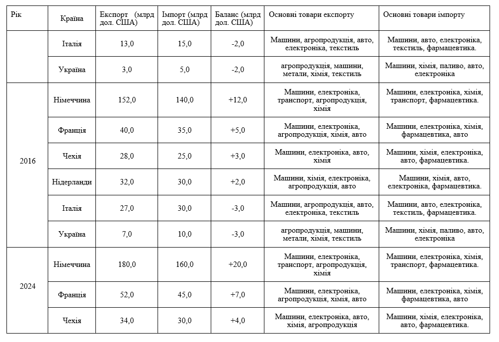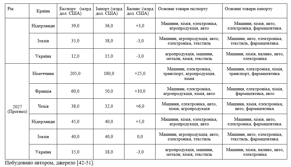 Що стосується імпортної складової, то в її структурі домінують інвестиційні та інноваційноємні товари (машини, електроніка, хімія, фармацевтика) — сукупно понад 51%. Це свідчить про технологічну залежність від західноєвропейських постачальників. Висока частка мінерального палива (7%) лишається вразливим місцем попри диверсифікацію шляхом LNG-терміналів та постачань зі Скандинавії. Профіцит (+81 млрд дол. США) забезпечують саме обробні товари з високою доданою вартістю, тоді як дефіцит концентрується в енерго- та хімікоємних позиціях.