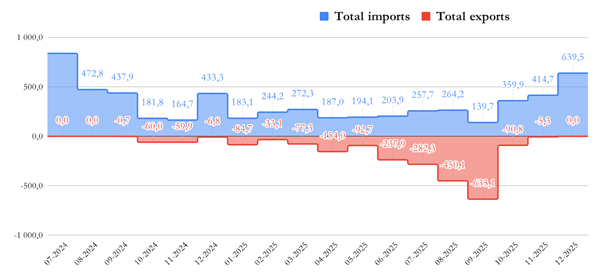 In December, Ukraine imported 639.5 MWh, which is a record volume since August 2024. There were no electricity exports in December. Exports were halted on November 11 due to power system capacity shortages.