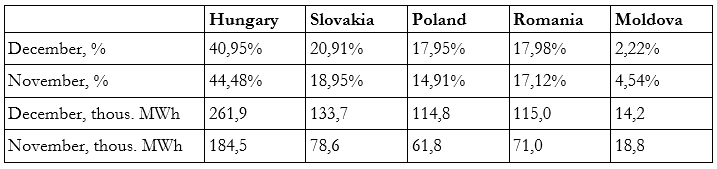 Traditionally, Hungary was responsible for the largest share of imports. In general, the electricity import pattern remained almost the same as in November.