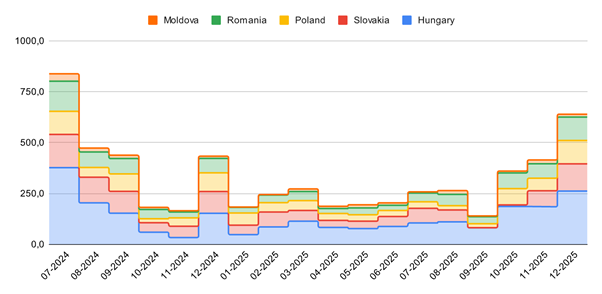 Most of the gas came from Hungary and Poland, which remain the cheapest routes for gas imports into Ukraine. Gas imports also came from Slovakia and the Trans-Balkan route, where a joint capacity booking route – Route 1 from Greece (70 mcm), which became operational in 2025.