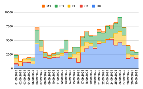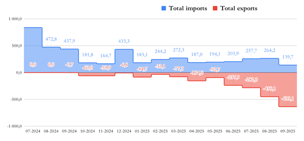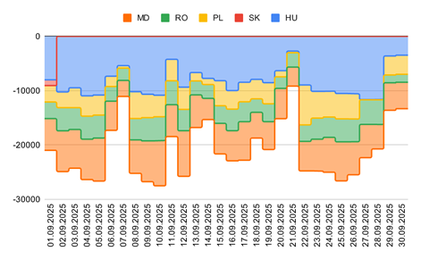 At the beginning of September, the rise in exports was even more noticeable compared to August. In the last 14 days of August, exports totaled 289.5 thousand MWh, while in the first 14 days of September, they reached 307.3 thousand MWh. Conversely, imports showed the opposite trend: 52.7 thousand MWh entered the Ukrainian power system in the last 14 days of August, and nearly 44 thousand MWh in the first two weeks of September. This indicates that net exports in the first half of September are significantly higher than exports in the second half of August.