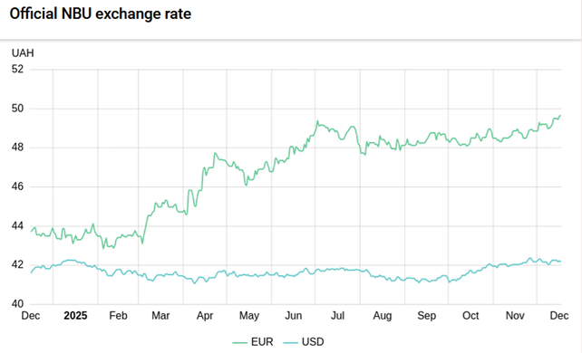 We expect the hryvnia/US dollar exchange rate in December to fluctuate between 42.0 and 42.5, with a possible peak of 43 by year-end. At the same time, we expect the euro exchange rate in December to be in the 49–50 range.
