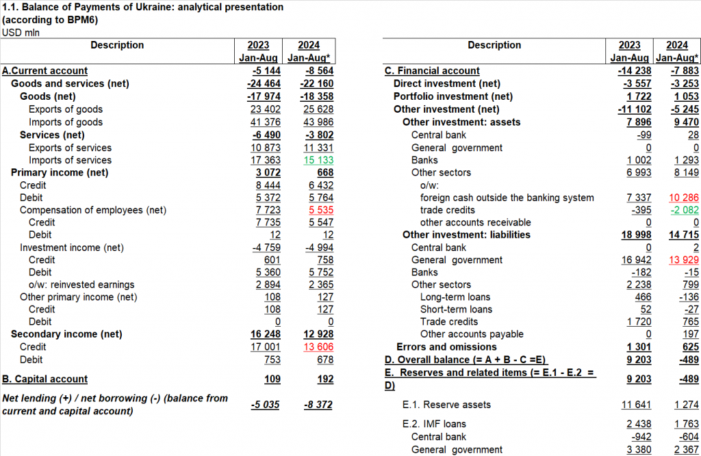 1) Remittances from migrant workers to Ukraine. While USD 7.7 billion (USD 950 million per month) were transferred between January and August a year ago, only USD 5.5 billion (USD 700 million per month) were transferred in 2024, showing a further downward trend;