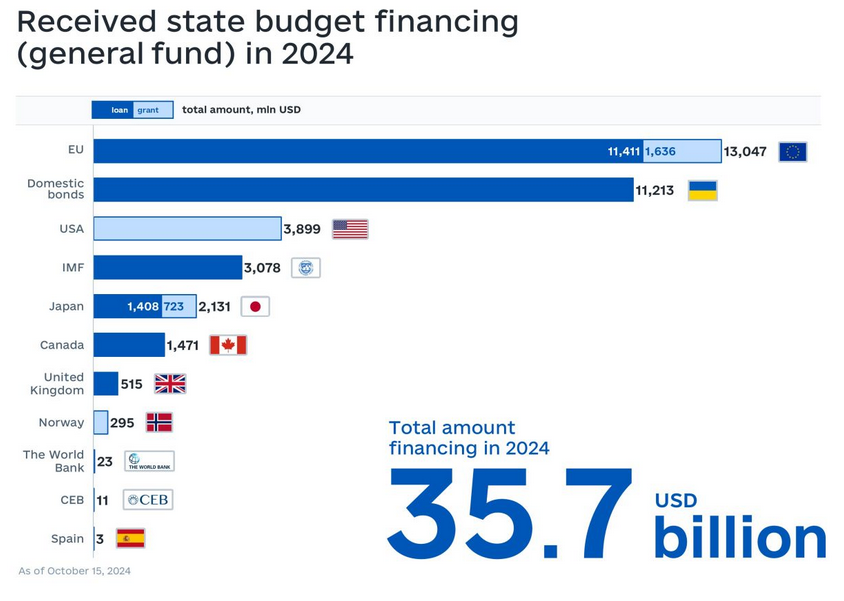 In the first nine months, Ukraine received USD 24.5 billion in external financing. Of this, 6.6 billion were grants, and 17.9 billion were loans.