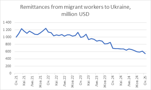 Additionally, remittances from Ukrainian workers abroad continue to decline. In January 2025, remittances fell to USD 546 million, whereas two years ago, they exceeded USD 1 billion per month. If the war persists, remittances are projected to drop to USD 200-300 million per month by the end of 2026.