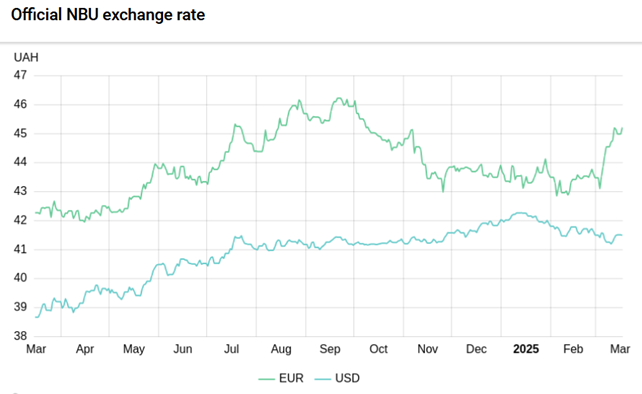 The hryvnia exchange rate in February exceeded our expectations. We had projected a rate of around 42 UAH/USD, but despite the absence of external financing in February, the National Bank managed to maintain the hryvnia at approximately 41.5 UAH/USD.