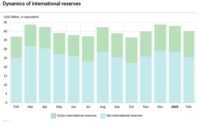 Ukraine’s international reserves decreased from USD 43 billion to USD 40.1 billion in February 2025.