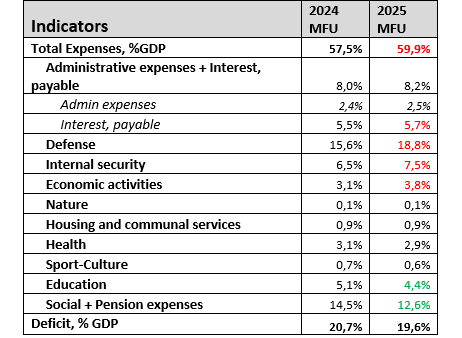 Budget 2025 is a military budget for the whole year 2025. The budget plans to increase security spending from 22.1% to 26.3% of GDP. However, not all of this is security spending. In 2023-2024, Western military aid was estimated at 10-12% of GDP in addition to Ukraine’s own spending. Ukraine is not confident that arms supplies from the West will be sufficient, so it is increasing its own arms production and plans to spend at least USD 10 billion.
