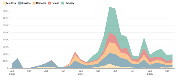 Electricity imports in May 2025 increased by 3.6% compared to April 2025. Import volumes from Moldova and Slovakia saw the largest growth, but Hungary still held the biggest share, accounting for 40%.