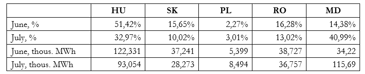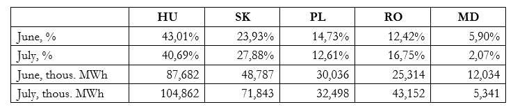 In July, Naftogaz accounted for over 90% of all imports, while privately owned companies imported the remaining gas. The largest volume of gas imported in July came from Hungary—300 million cubic meters (36% of all imports); 268 million cubic meters (32.2%) from Slovakia; 260 million cubic meters (31.2%) from Poland; and 5.1 million cubic meters (0.6%) from the Trans-Balkan routes. Most of the gas from the Trans-Balkan route originated from Greece. Private companies imported gas using this route.