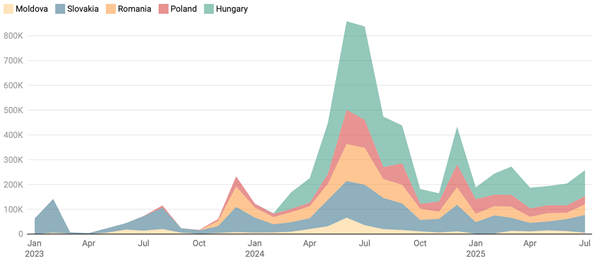 In July 2025, Ukraine increased electricity exports by 16%, compared to June 2025, to 282.2 thousand MWh. Supplies to Moldova increased sharply – exports in this direction took place almost at all hours of the day. In general, more than 115,000 MWh were exported to Moldova in July, which accounts for 41% of the total export volume. However, in all other directions, exports decreased.