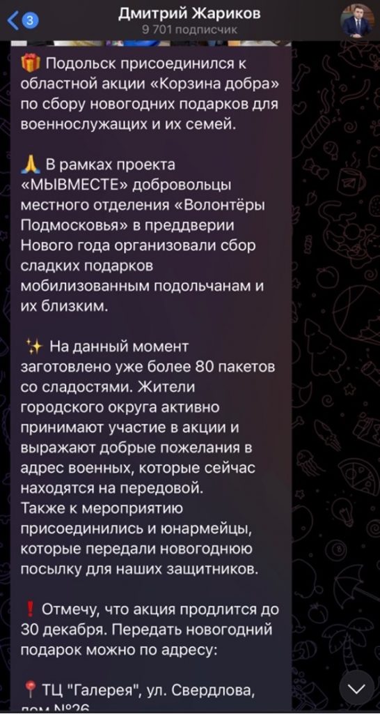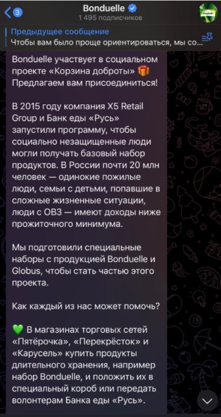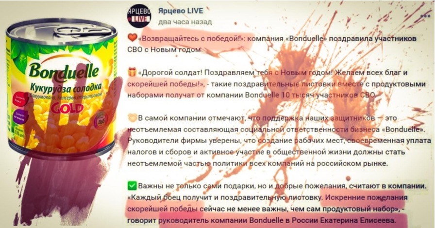 Journalists did not ignore the activities of the company itself. Thus, the French channel TB5Mond found that Bonduelle-Russia took part in the social action “Basket of Kindness”, the purpose of which is to help vulnerable segments of the population – lonely pensioners, families with children, which is not refuted by the company itself. But, on 30.12.2022, deputy Dmitry Zharikov published information about the accession of the city Podilsk to  this action, the purpose of which was to collect New Year’s gifts for the military and their families, and in this way the scandalous basket, according to journalists, could be in the hands of a military man taking part in the war.
